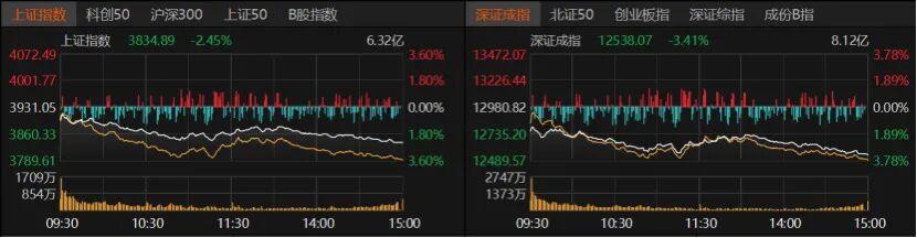 截至今日收盘,沪指收跌2.45%报3834.89点,创业板指收跌4.02%报2920.08点,深证成指、科创50均跌逾3%,沪深300跌幅超过2%,上证50跌近2%,北证50跌近5%。