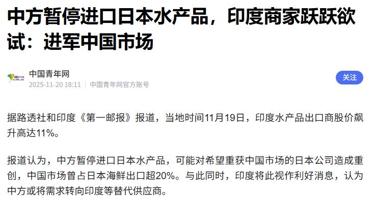 中国宣布暂停进口日本水产品后,印度水产企业似乎看到了抢占市场的绝佳机会——股价单日飙升11%,媒体欢呼“中国市场大门敞开”。然而,这场看似水到渠成的“接班”,实则面临着食品安全、消费信任和产业实力的三重考验。