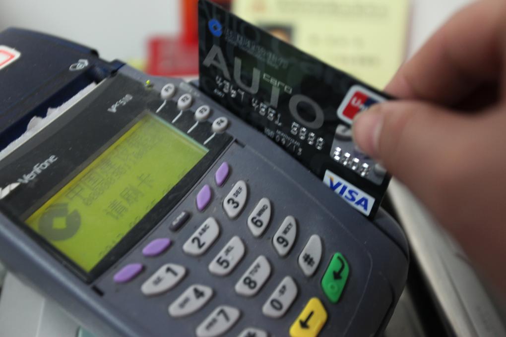 一商家工作人员在POS机上刷卡。新华社发(李俊锋 摄)