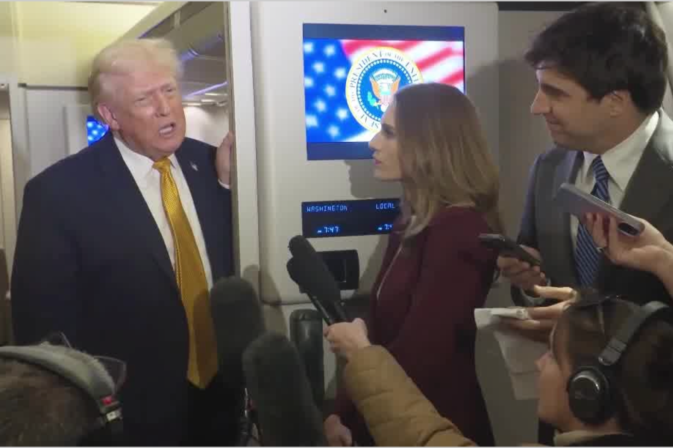 1月4日,美国总统特朗普在总统专机“空军一号”上面对媒体,向委内瑞拉、哥伦比亚、古巴、伊朗、墨西哥等国发出威胁。图片来源:新华社