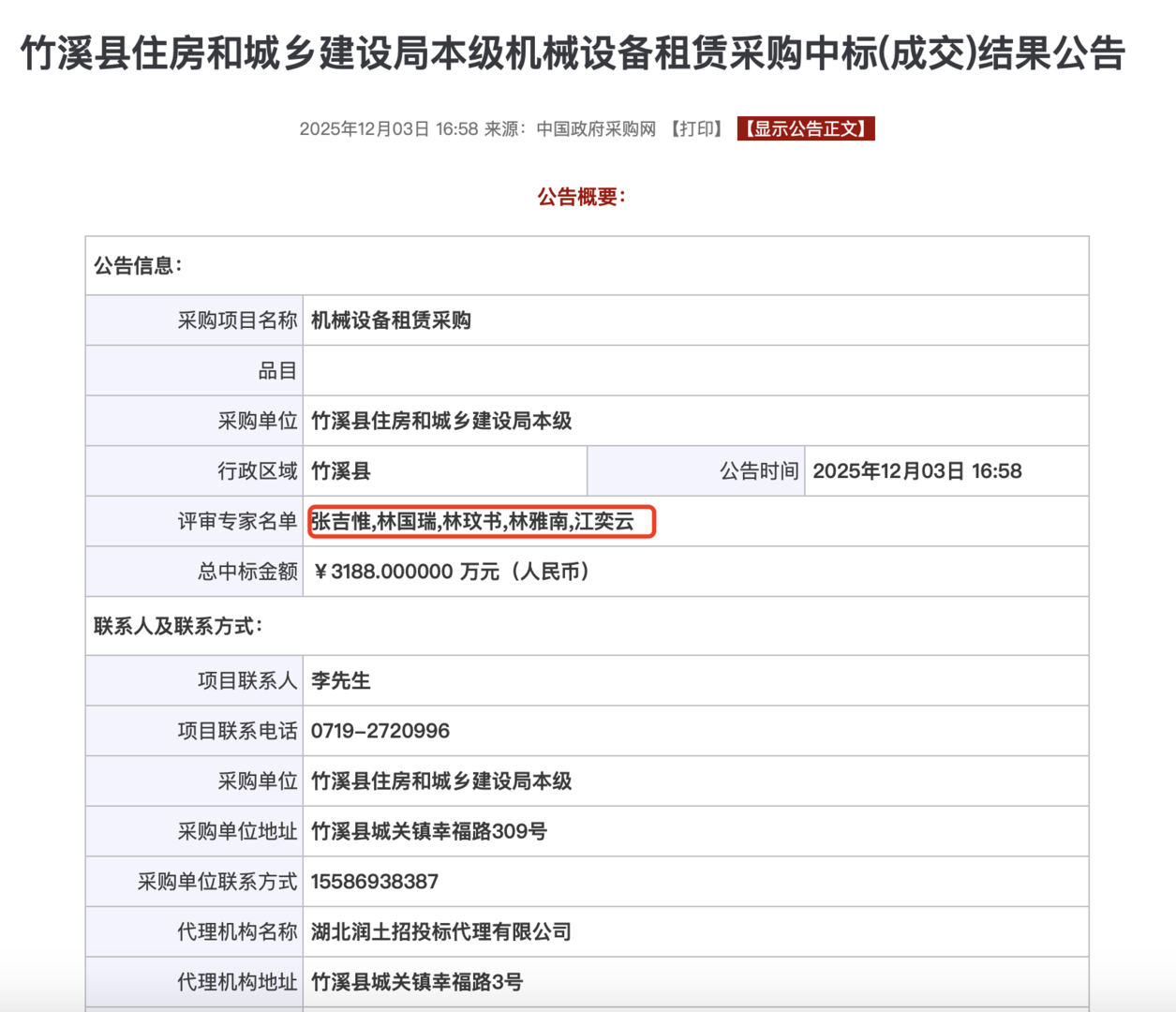 12月3日,竹溪县住建局机械设备租赁采购评审小组成员被发现使用网络虚名。竹溪县住建局随后发布通报,称已终止该项目招投标程序,并将依法依规处理相关责任人。当地纪委已成立调查组,正在进行核查。