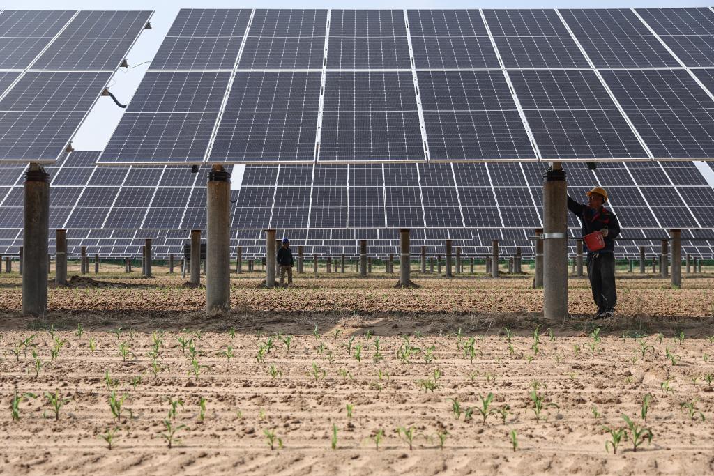 2025年5月29日,工作人员在辽宁彰武县章古台镇光伏+治沙生态产业项目现场对光伏板进行维护。