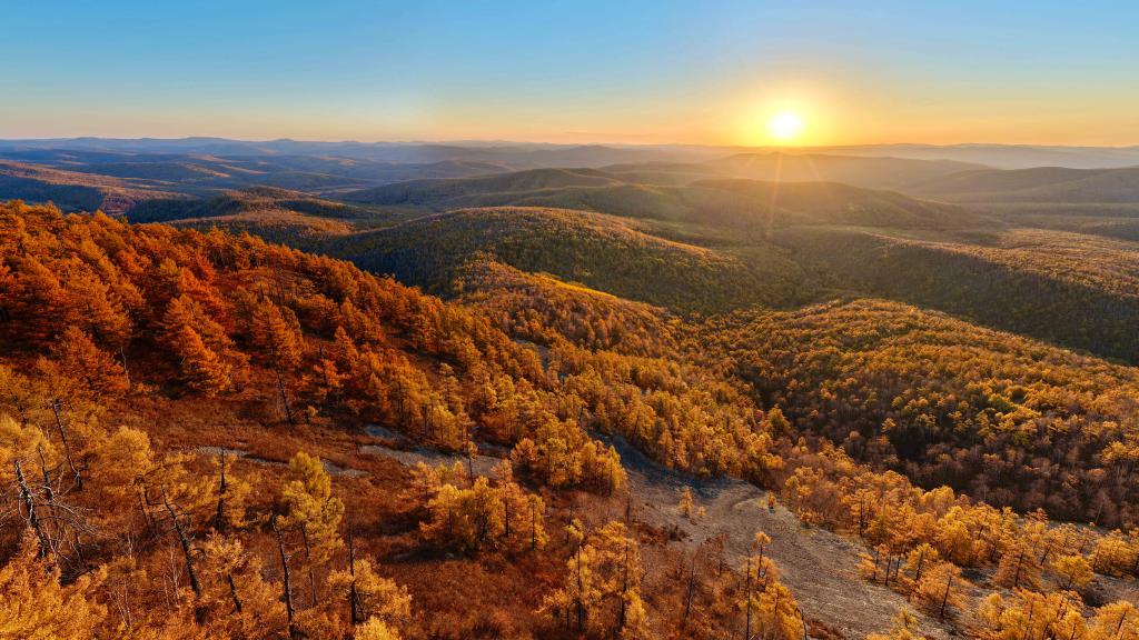 这是2025年9月28日在内蒙古牙克石市绰河源镇拍摄的大兴安岭林海日出(无人机拼接照片)。