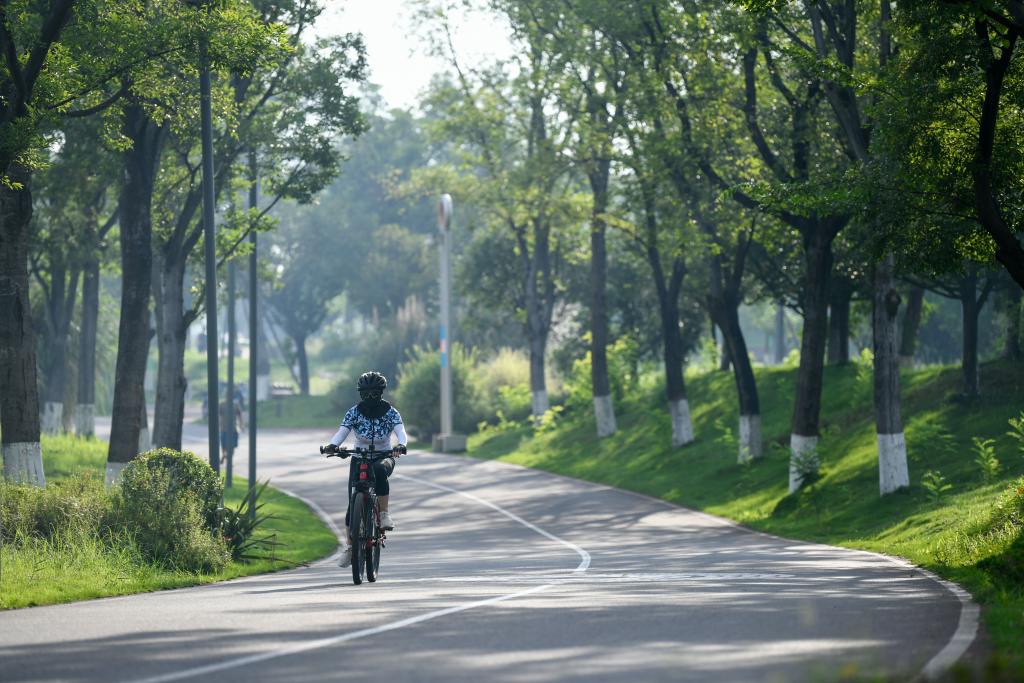 市民在成都天府绿道骑行(2023年7月16日摄)。