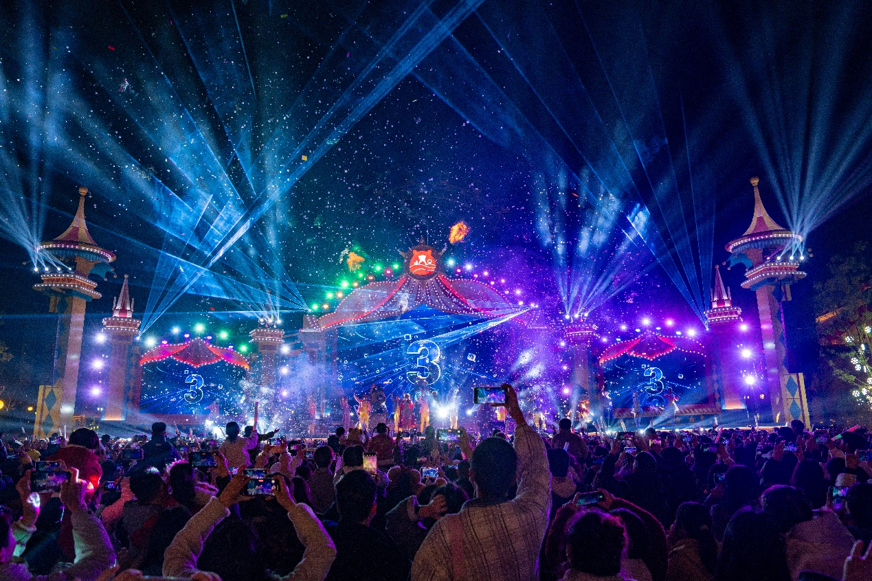 跨年夜当晚,全国多地方特主题乐园延时营业至零点,音乐盛典、蹦迪派对、摩天轮倒计时、心愿气球放飞等活动接连登场。济南、大同、青岛、赣州、沈阳等地园区邀请百大DJ、知名歌手和人气乐队助阵,结合无人机灯光秀、烟花盛放与光影倒计时,营造极具仪式感的迎新时刻。