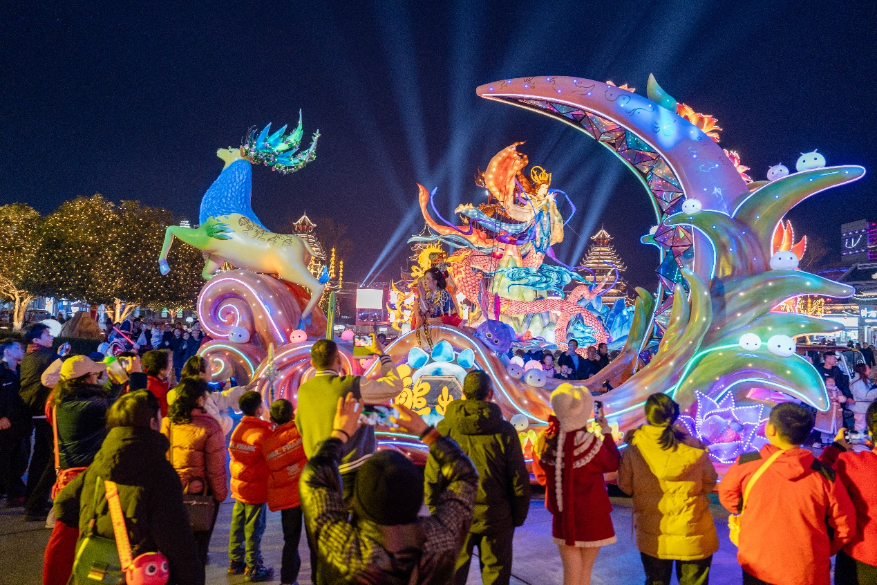 在光影营造方面,自贡、太原方特以恐龙、西游等经典IP为灵感,推出炫彩花灯盛会,点亮夜间文旅新空间。徐州方特非遗“药发木偶戏”、淮安方特互动游戏新玩法、长沙方特“国潮瑞兽大巡游”、邯郸方特木偶剧团舞会等特色内容轮番上演,进一步丰富游客节庆体验。