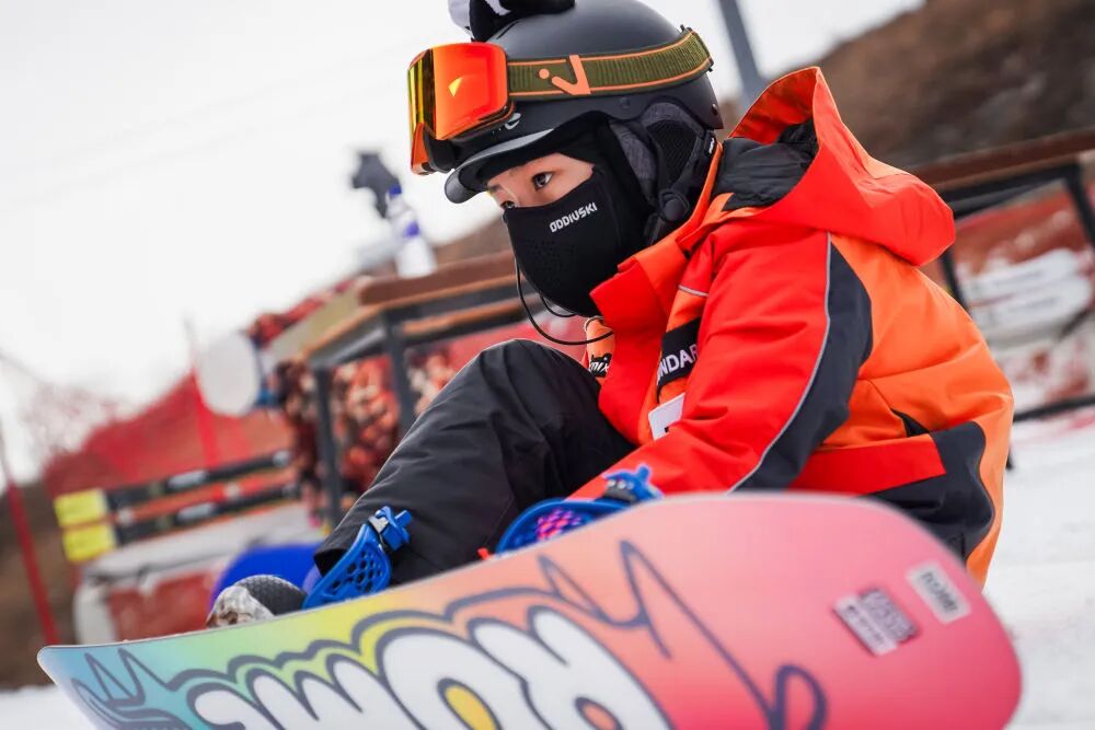 11月15日,在位于吉林省吉林市的中旅松花湖度假区,一名小朋友穿戴雪板。新华社记者 许畅 摄